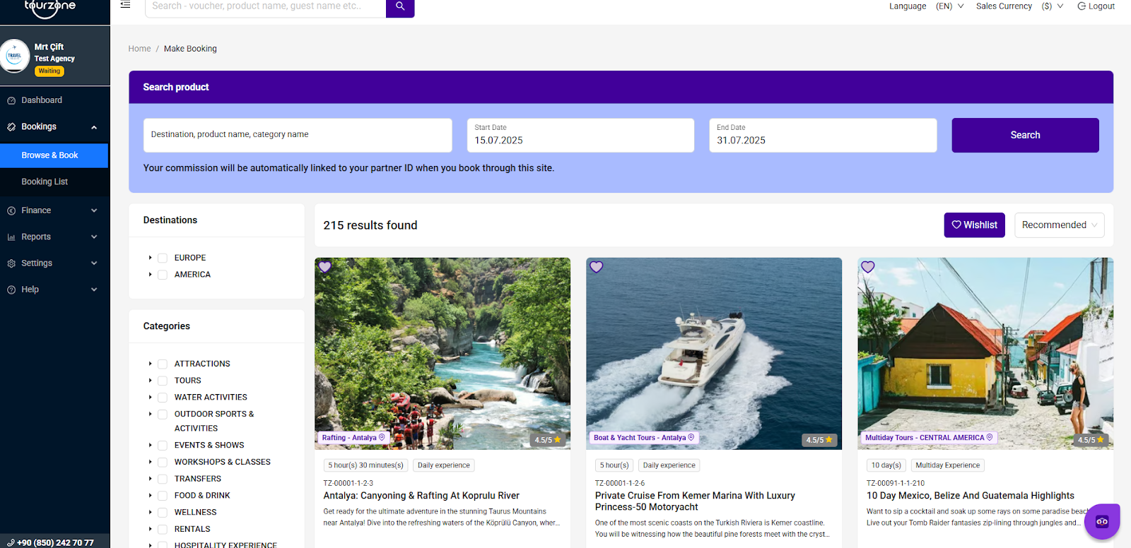 The Booking Panel in Tourzone is your main tool to search, filter, and book tour products efficiently. It provides agencies with a visual and functional interface to browse through a wide catalog of experiences, set date ranges, and apply filters for destination and category.