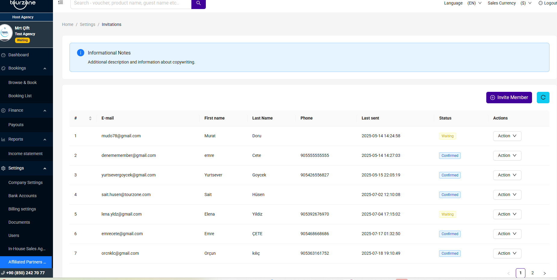 Invite new partners using the “Invite Member” button — input their email, name, surname, and phone number.