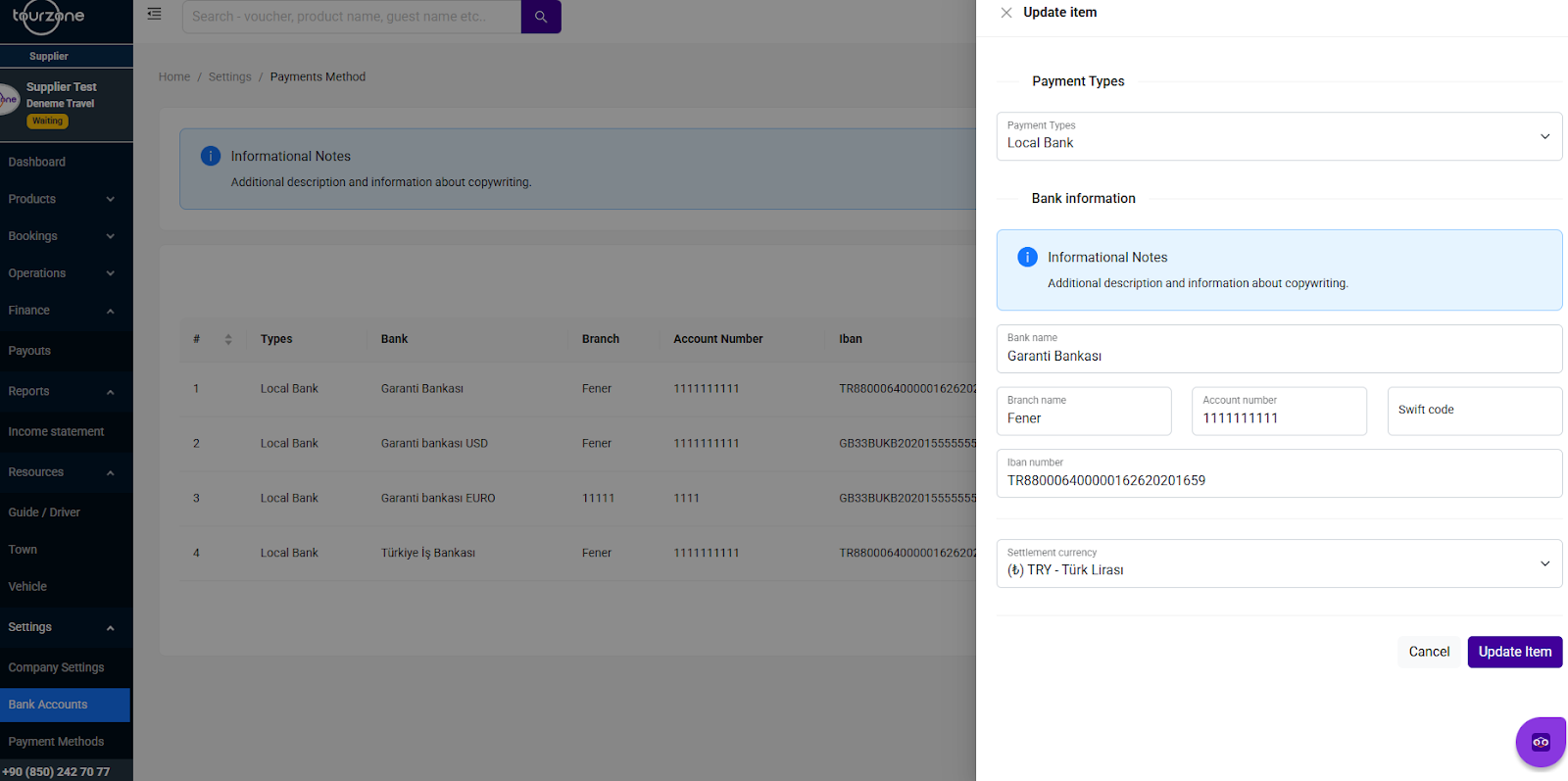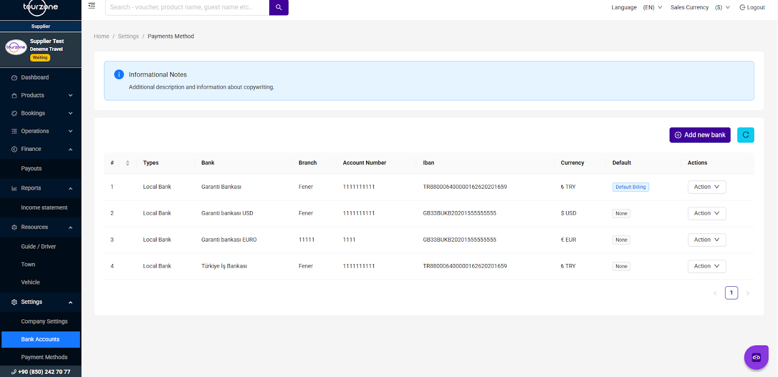 The Bank Accounts section lets you securely add, view, and manage your company’s banking details used for payouts on the Tourzone platform.