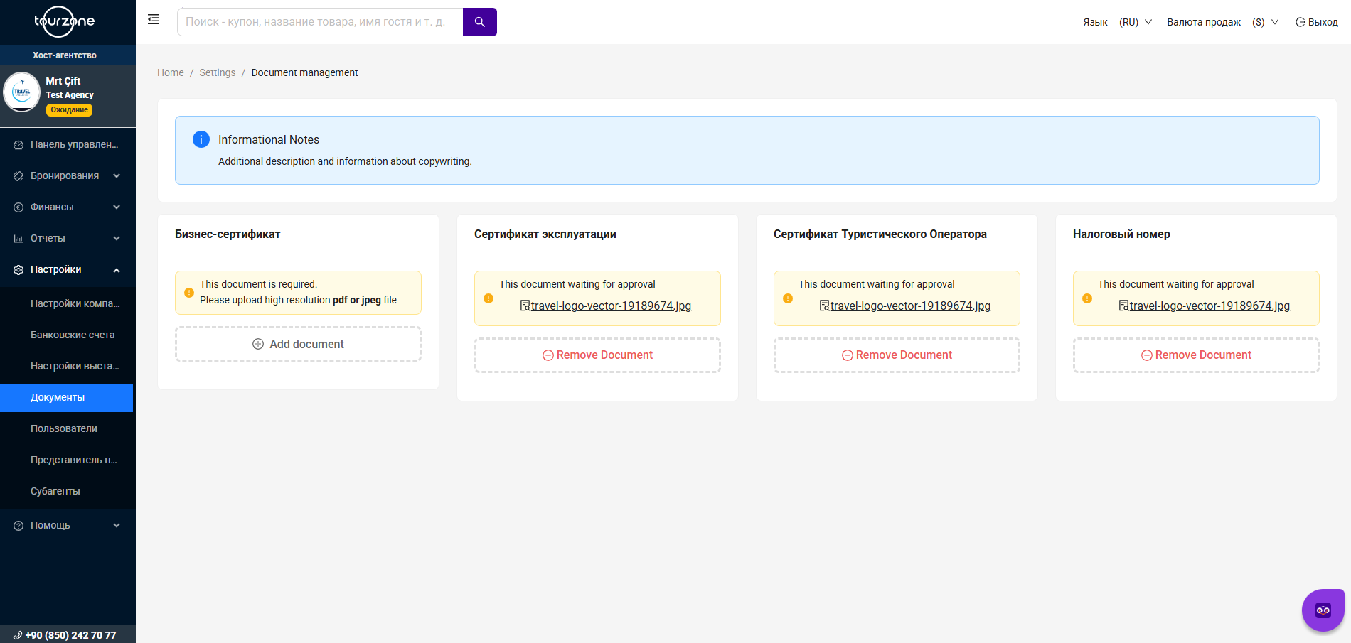 Панель «Документы» является обязательной для прохождения верификации и активации агентства на платформе Tourzone. Чтобы приступить к продажам, необходимо загрузить требуемые юридические документы.