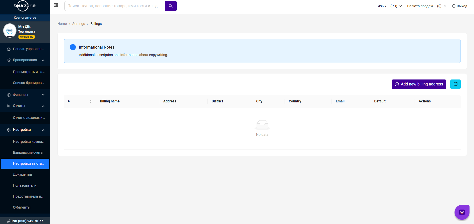 Раздел Настройки выставления счетов позволяет добавлять, редактировать и управлять платёжными адресами, которые будут отображаться в ваших официальных счётах. Вы можете добавить несколько адресов и выбрать один из них в качестве адреса по умолчанию для всех выставляемых документов.