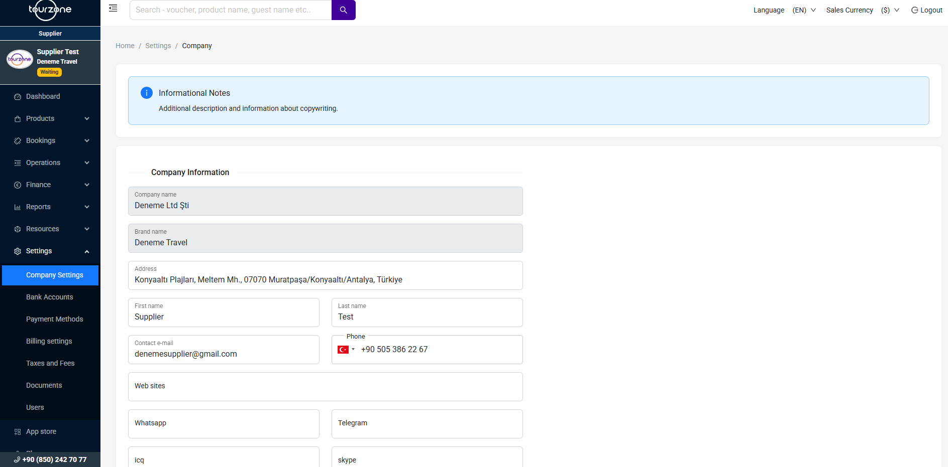 Название компании – официальное юридическое название (например, Deneme Ltd Şti)