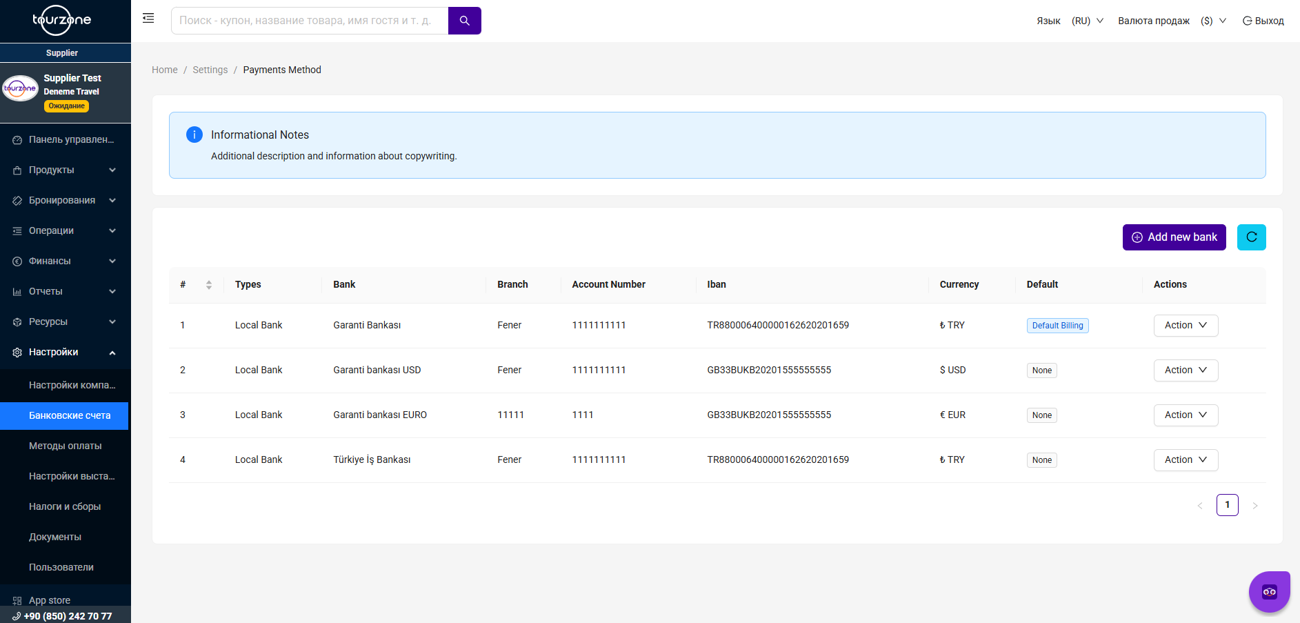 Чтобы получать выплаты за выполненные бронирования, необходимо добавить хотя бы один действующий банковский счёт в свой профиль. Tourzone поддерживает несколько валют и позволяет управлять несколькими счетами в разделе банковских счетов.