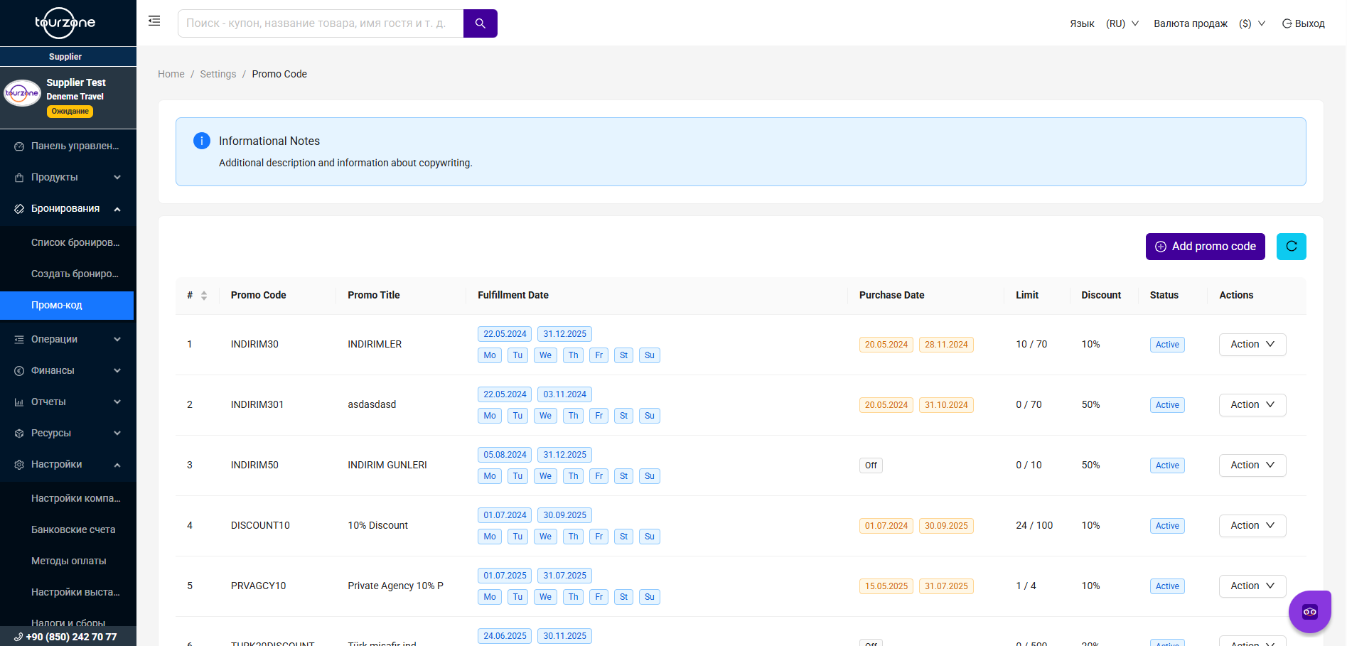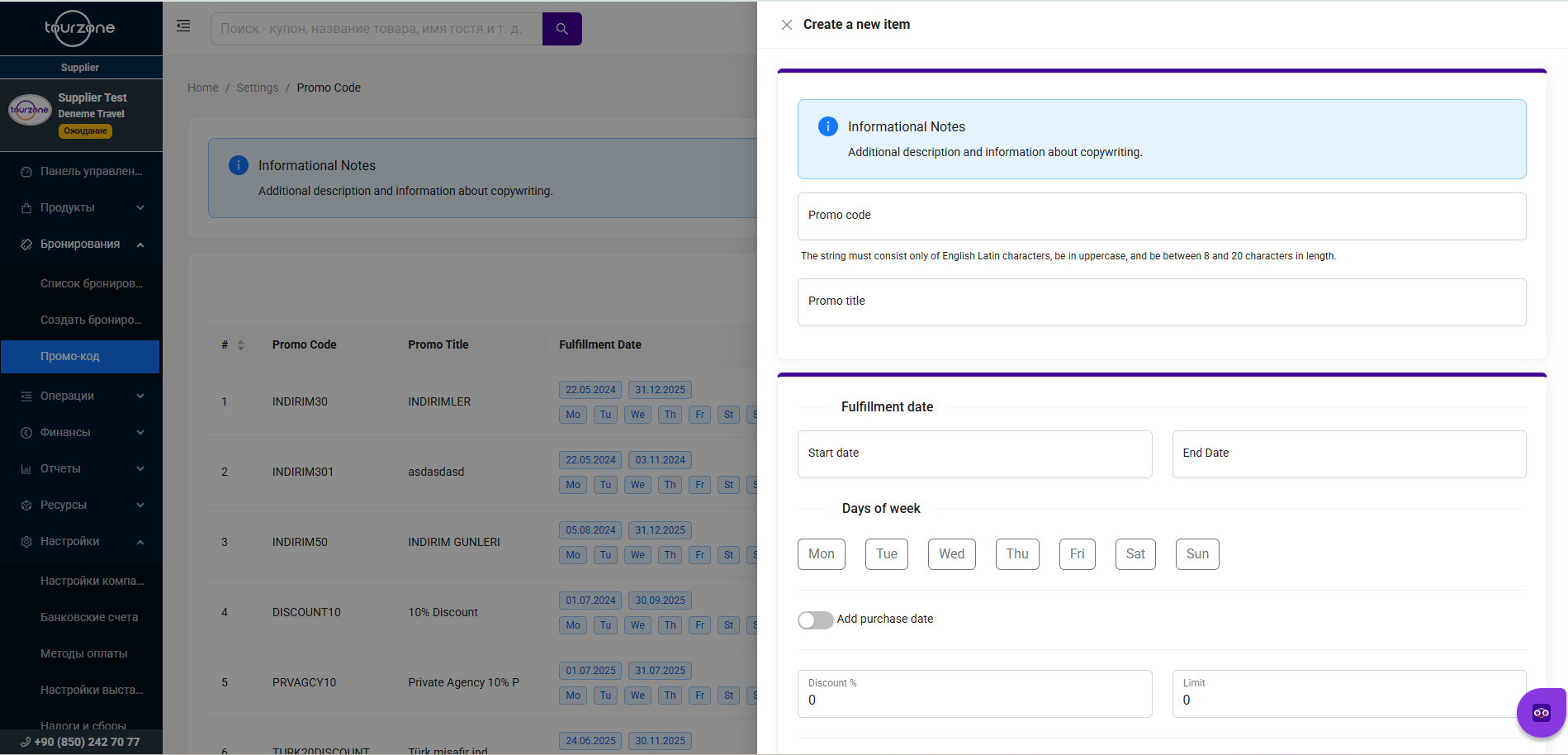 Промокоды позволяют предоставлять скидки на выбранные продукты в определённые даты, дни недели или в рамках заданных ограничений по использованию. На платформе Tourzone вы можете легко создавать и управлять такими кодами в разделе промокодов.