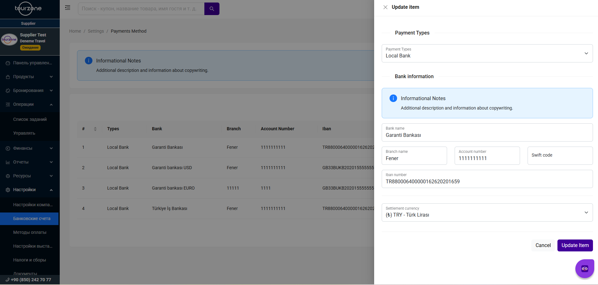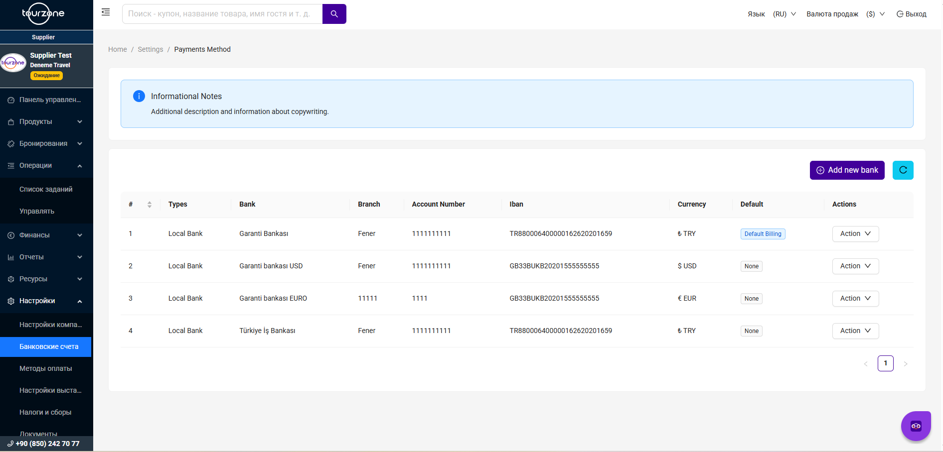 Раздел «Банковские счета» позволяет безопасно добавлять, просматривать и управлять банковскими реквизитами вашей компании, которые используются для выплат на платформе Tourzone.