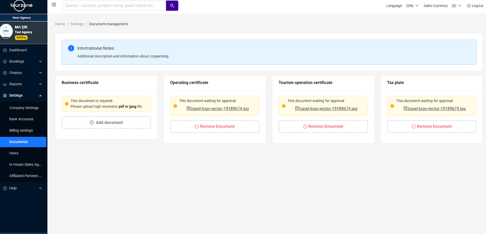 Settings > Documents sekmesinde aşağıdaki belgeleri yükleyin: