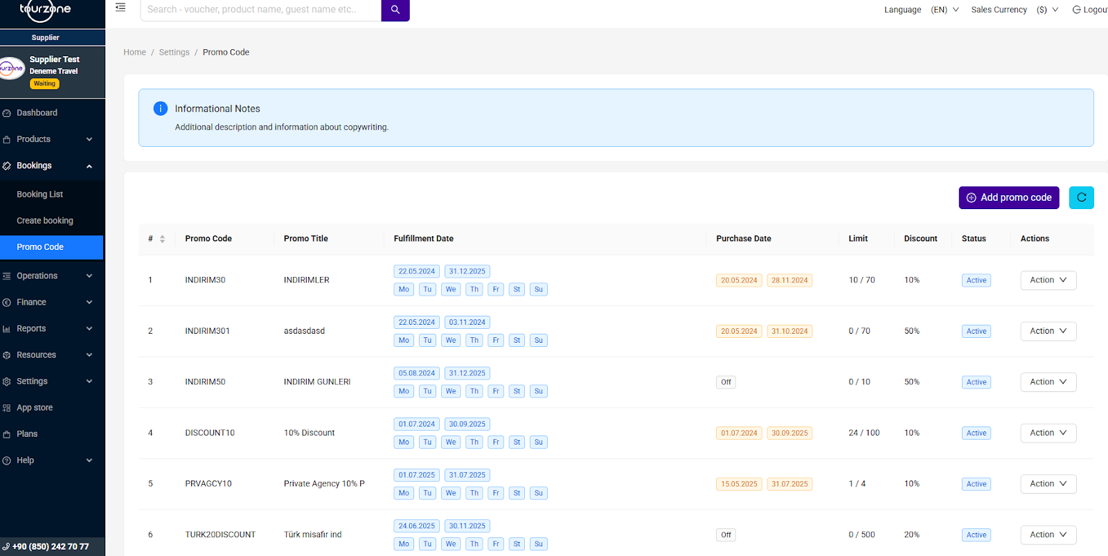 Tourzone platformunda bu kodları kolayca oluşturabilir ve Promo Code panelinden yönetebilirsiniz.